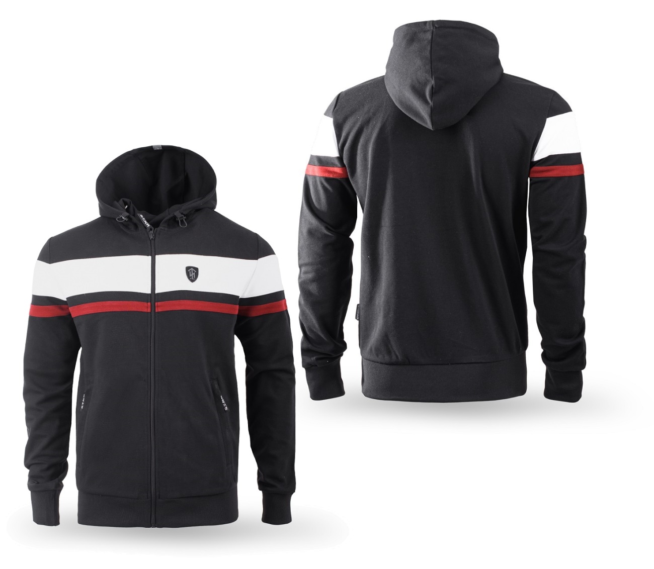 Klassische Kapuzenjacke mit plakativem Wikingermotiv hinten. Kapuzenfutter ton in ton; verdeckter Reißverschluss; Brustmotiv bestehend aus einer Druck-Stickkombination; Runenstick am Ärmel, Rückemotiv: Photodruck und zusätzlicher Stickerei; dezentes Labeling an der Kapuze und an der Seitennaht.