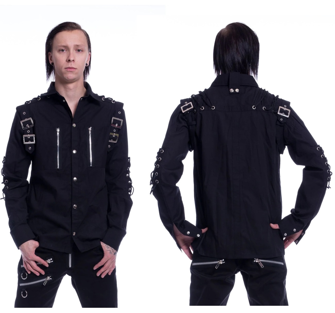 Langarmhemd aus fester Baumwolle mit Druckknopfleiste, Schnürung und Schnallen.