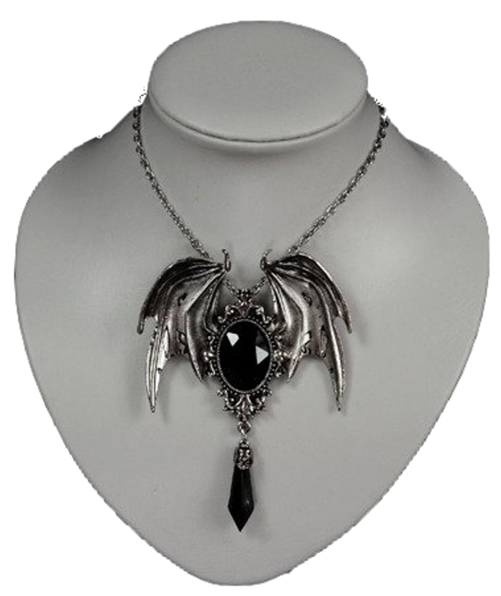 GothicketteDer silberne Anhänger mit Fledermausflügeln ist aus Metall und hat einen schwarzen facettierten Stein, mit Tropfen. Verschlossen wird die Kette mit einem Haken.