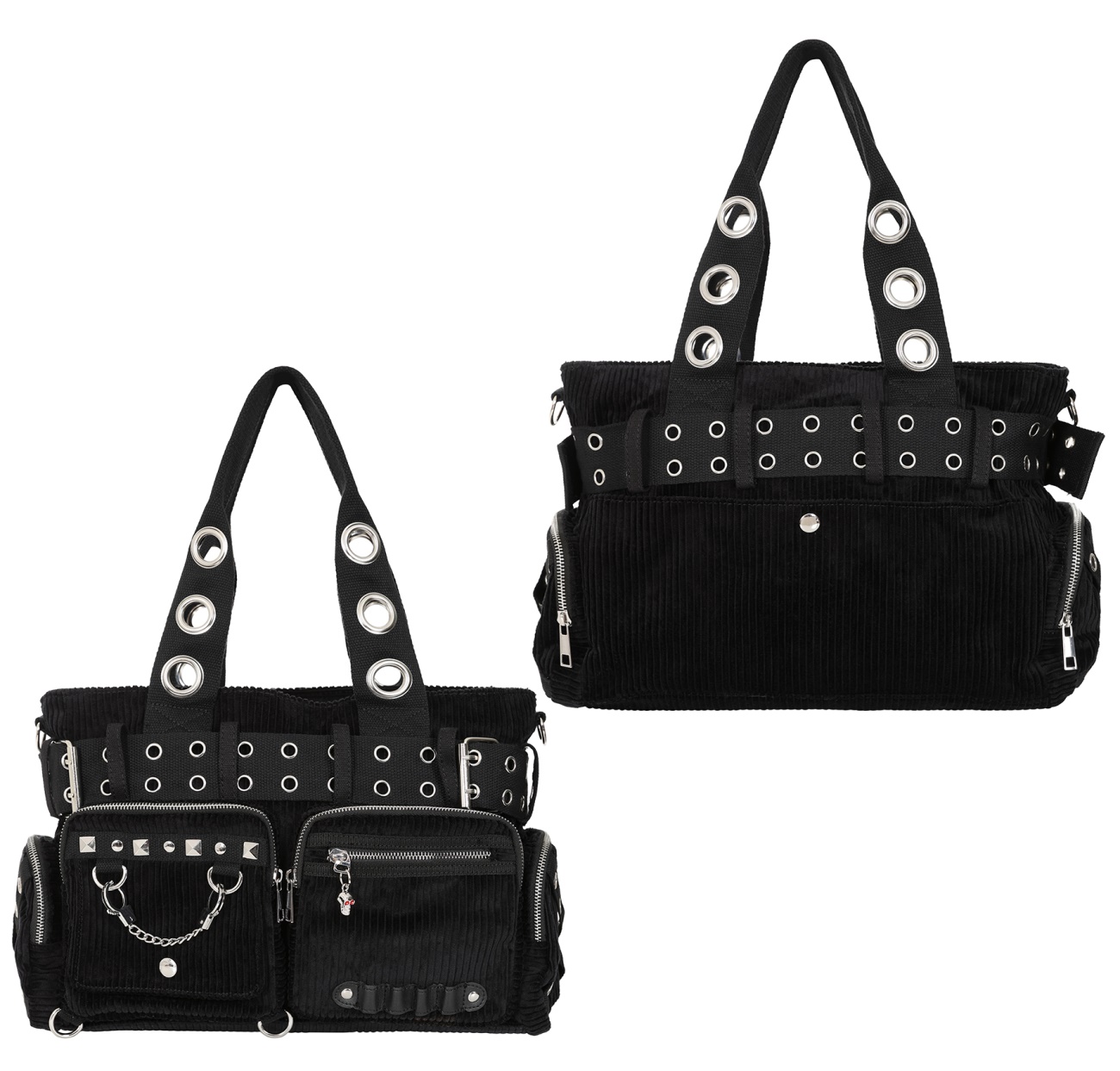 Handtasche in schwarzem Breitcord, mit 5 Außentaschen, sowie eine kleine Innentasche mit Reißverschluss und zwei Einstecktaschen. Die Tasche verfügt über einen langen verstellbarer Gurt, kann damit auch als Umhängetasche getragen werden.