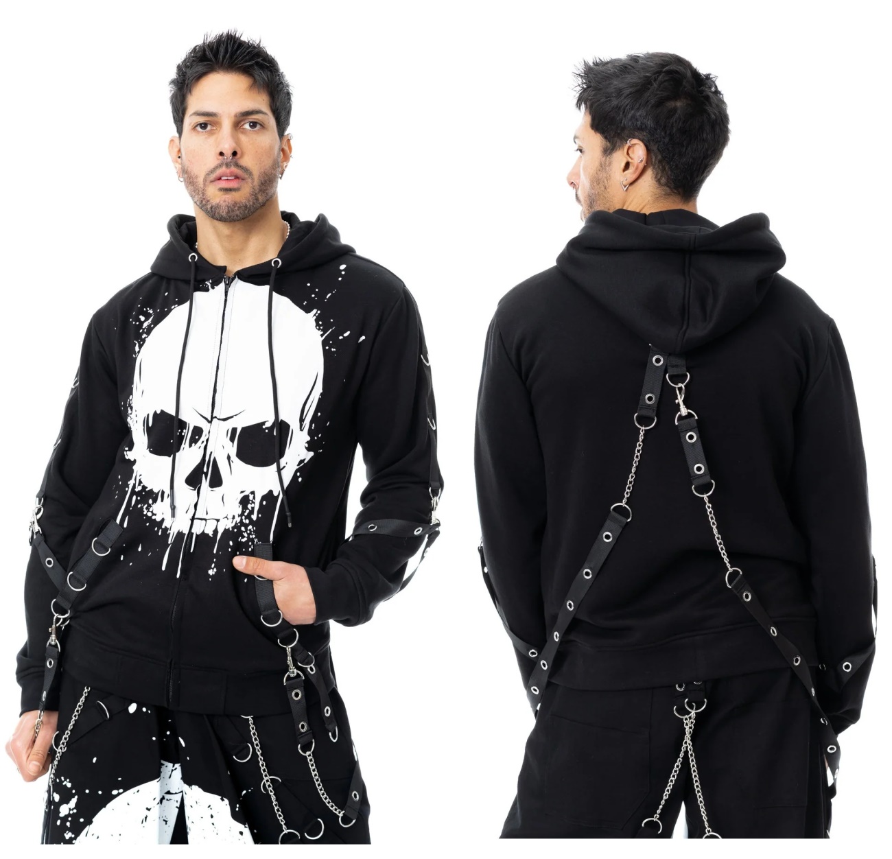 Gemütliche Sweatjacke mit weissem Totenkopfdruck und abnehmbaren Ketten und Bändern. unisex