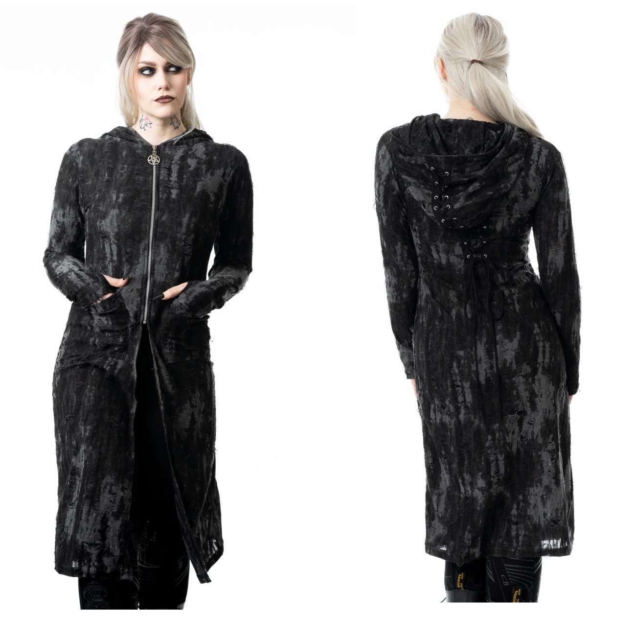 Lange,leichte Jacke im schwarzgrauem Grungelook. Die Jacke ist mit Rissen versehen. Von der Kapuze bis zur Mitte des Rückens gibt es eine Schnürung. Im Frontbereich mit kurzem Reißverschluss, so die Jacke, ab Mitte offen bleibt. Vorn 2 Taschen.