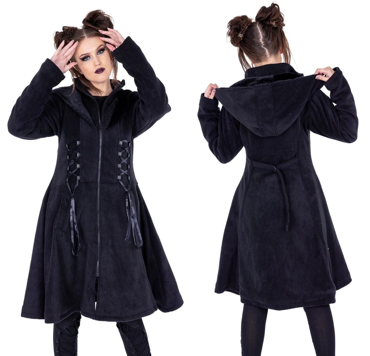 Leichter, kuschliger Fleecemantel von Poizen Industries. Der Mantel hat flache, silberne Nieten an den Schultern und Taschen. Er ist leicht ausgestellt und hat eine große Kapuze, welche ebenfalls mit Nieten besetzt ist. Der Mantel ist ideal als Übergangsmantel.