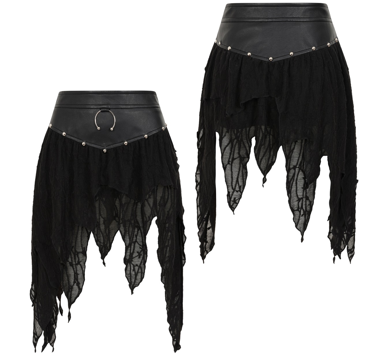 Der Rock besticht durch die markante Kombination aus Kunstleder und strukturiertem Strickstoff und kreiert so ein markantes und einzigartiges Design. Der hoch taillierte Bund wird durch einen metallischen O-Ring und kleine Nietenverzierungen akzentuiert, die dem Rock einen Hauch von Gothic-Flair verleihen. Der untere Teil des Rocks besticht durch mehrlagige, gezackte Einsätze aus leichtem, halbtransparentem Strickstoff, der anmutig fließt und einen verspielten, ätherischen Effekt erzeugt. Der Kontrast zwischen dem glatten Kunstleder und dem weichen, strukturierten Strickstoff erzeugt eine dynamische, alternative Ästhetik und macht diesen Rock zu einem Highlight für alle, die einen ausgefallenen und dennoch femininen Stil schätzen.