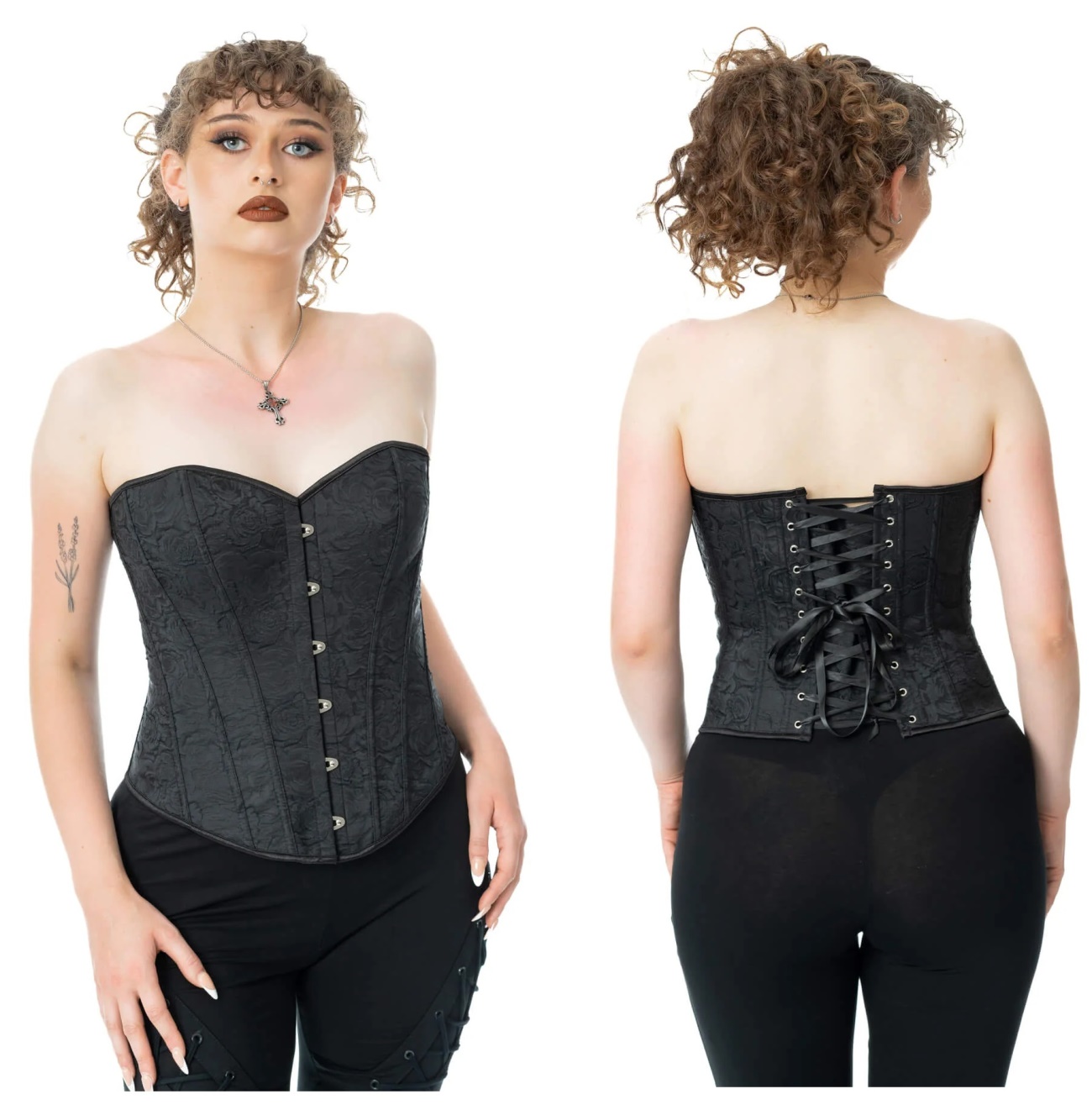 Überbrustcorsage aus fester Baumwolle mit Cut off Optik und Kunstlederschnallen. Vorn befindet sich ein durchgängiger Reißverschluss, durch stabile PVC Stäbchen und eine stabile Rückenschnürung formt die Korsage den Körper.