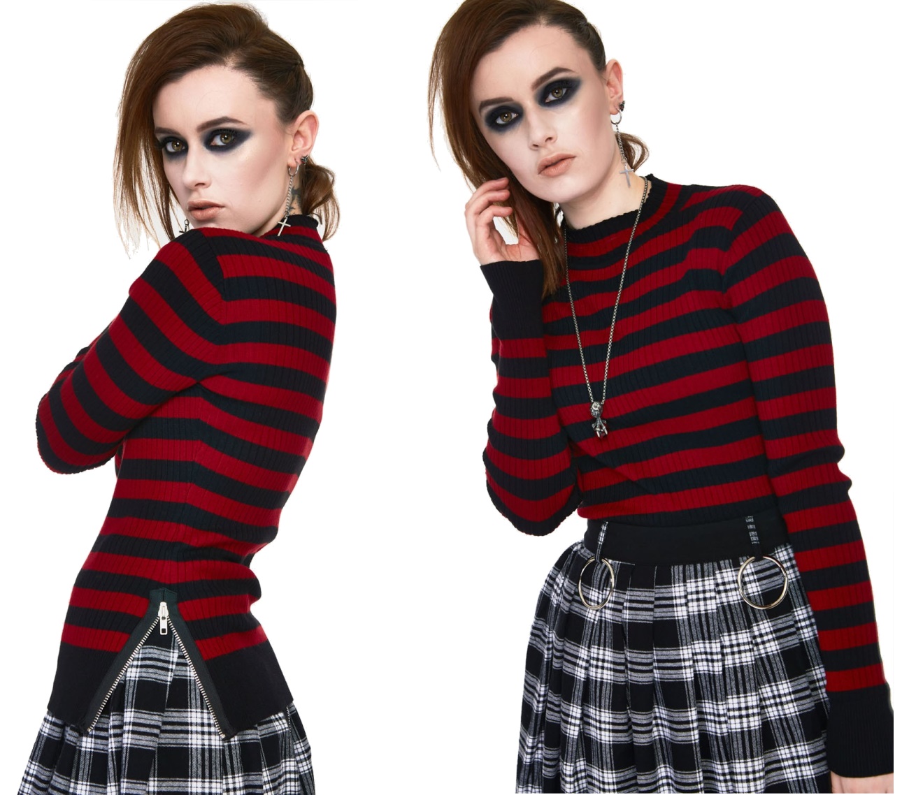 Figurbetonter Strickpullover in schwarz/rot gestreift von Jawbreaker. Auf beiden Seiten, am Ende des Saums, ist ein Zierreißverschluss.