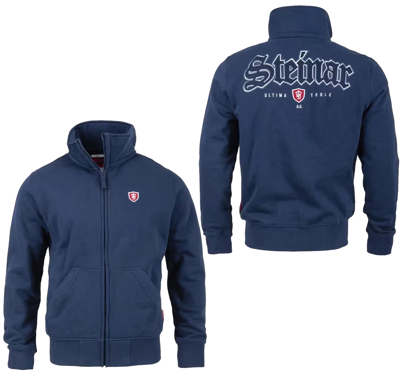 Tolle Thor Steinar Sweatjacke aus weichem Material und hochwertiger Verarbeitung. Gesticktes Wappen auf der Brust; verdeckter Reißverschluss; aufgesetzte Kängurutaschen; Rückenmotiv bestehend aus einer doppellagigen Filzapplikation mit zusätzlichen Stick; elastische Bündchen.